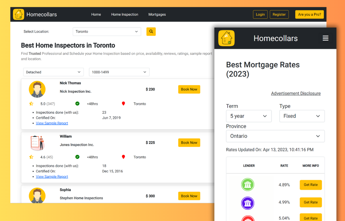 Join many Canadians who are comparing and saving more during real estate buy or sell transactions using Homecollars. Compare Mortgage rates, Home inspectors and do much more...