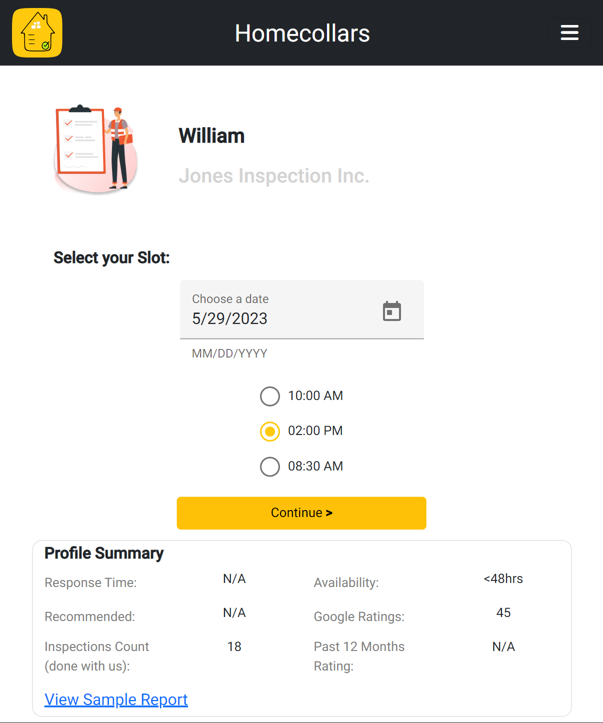 Review the provider's profile and select your available slot to send a booking request instantly in realtime.